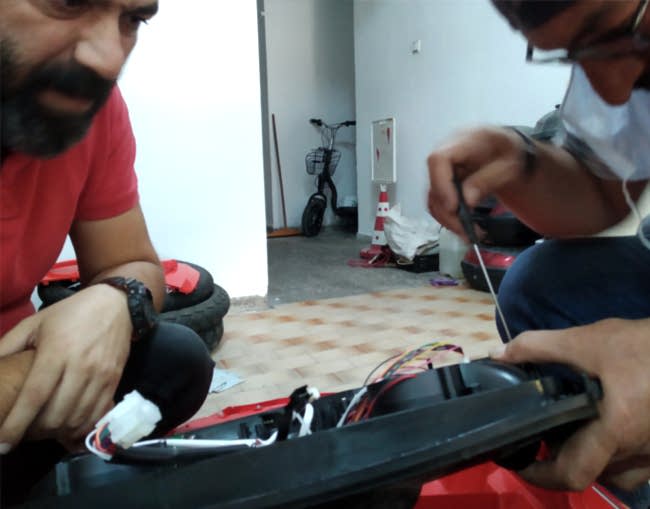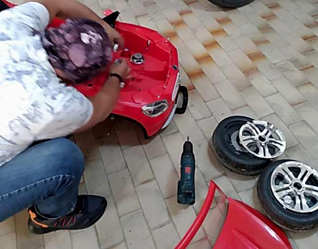 Azerbaycan'daki oyuncak mağazamızda akülü araba tamiri yapılıyor.